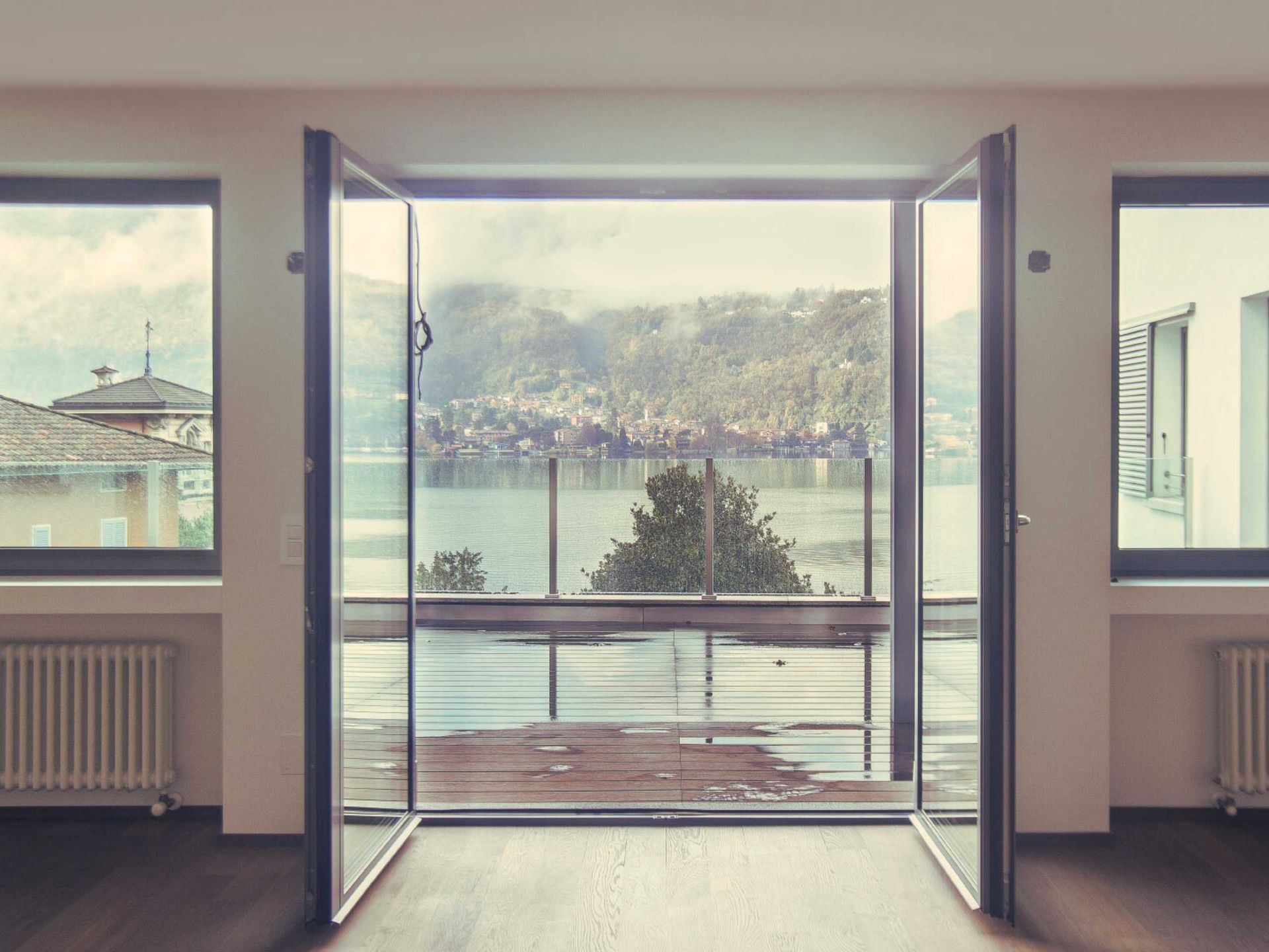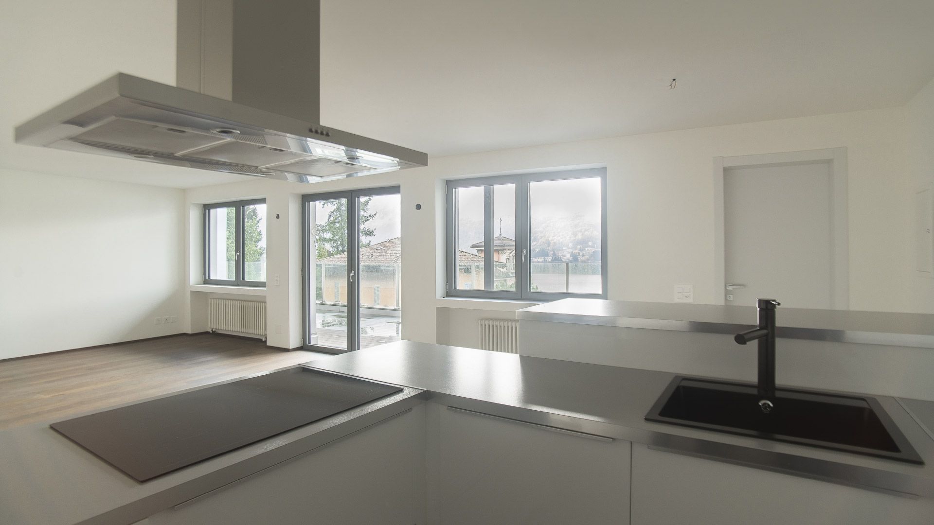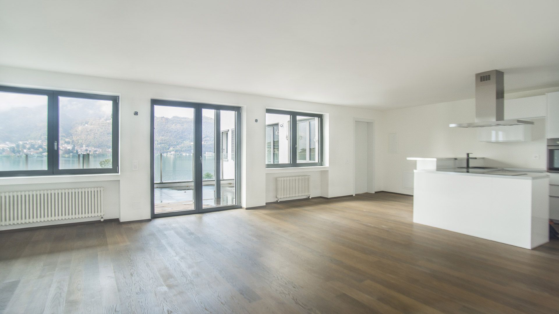 Gli spazi sono valorizzati da finiture di qualità, tra cui pavimenti in legno massello, superfici in resina nei bagni, serramenti di ultima generazione e parapetti in vetro temperato. L’ampia terrazza con vista lago rappresenta un naturale prolungamento della zona giorno e offre uno spazio esterno fruibile e riservato, un’area vivibile e un valore aggiunto durante le belle giornate di sole.